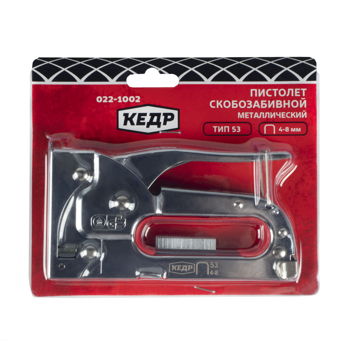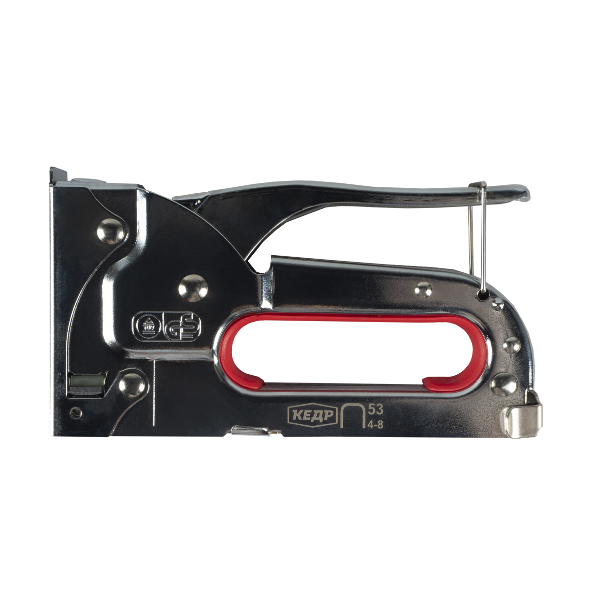 Пистолет в металлическом корпусе для забивания мебельной П-образной скобы. Рассчитан на скобы типа 53 шириной от 4 до 8 мм.
