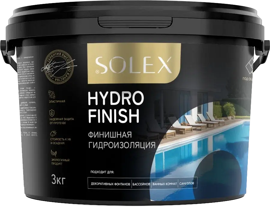 Надежная и безопасная Финишная гидроизоляция SOLEX идеальна для бассейнов, ванных комнат, санузлов и декоративных фонтанов, а так же полов, стен, потолков внутри и снаружи помещений, крыш, фундаментов, подвалов, гидротехнических сооружений, балконов, террас.