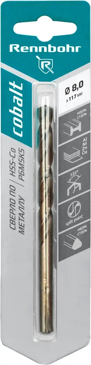 Сверло по металлу, 3-гр. хвост.,8,0х117мм, HSS-Co, Р6М5К5, 1шт/уп, RENNBOHR COBALT CARD 668080