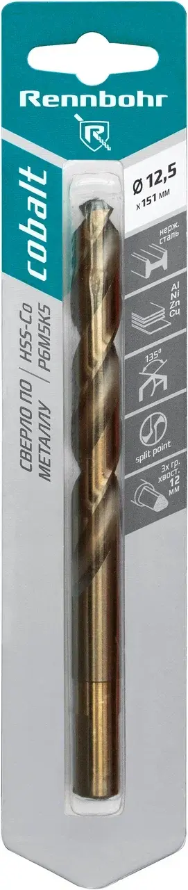 Сверло по металлу, 3-гр.хвост.12,5х151мм (Хв.12мм), HSS-Co,1шт/уп, RENNBOHR COBALT CARD 668125